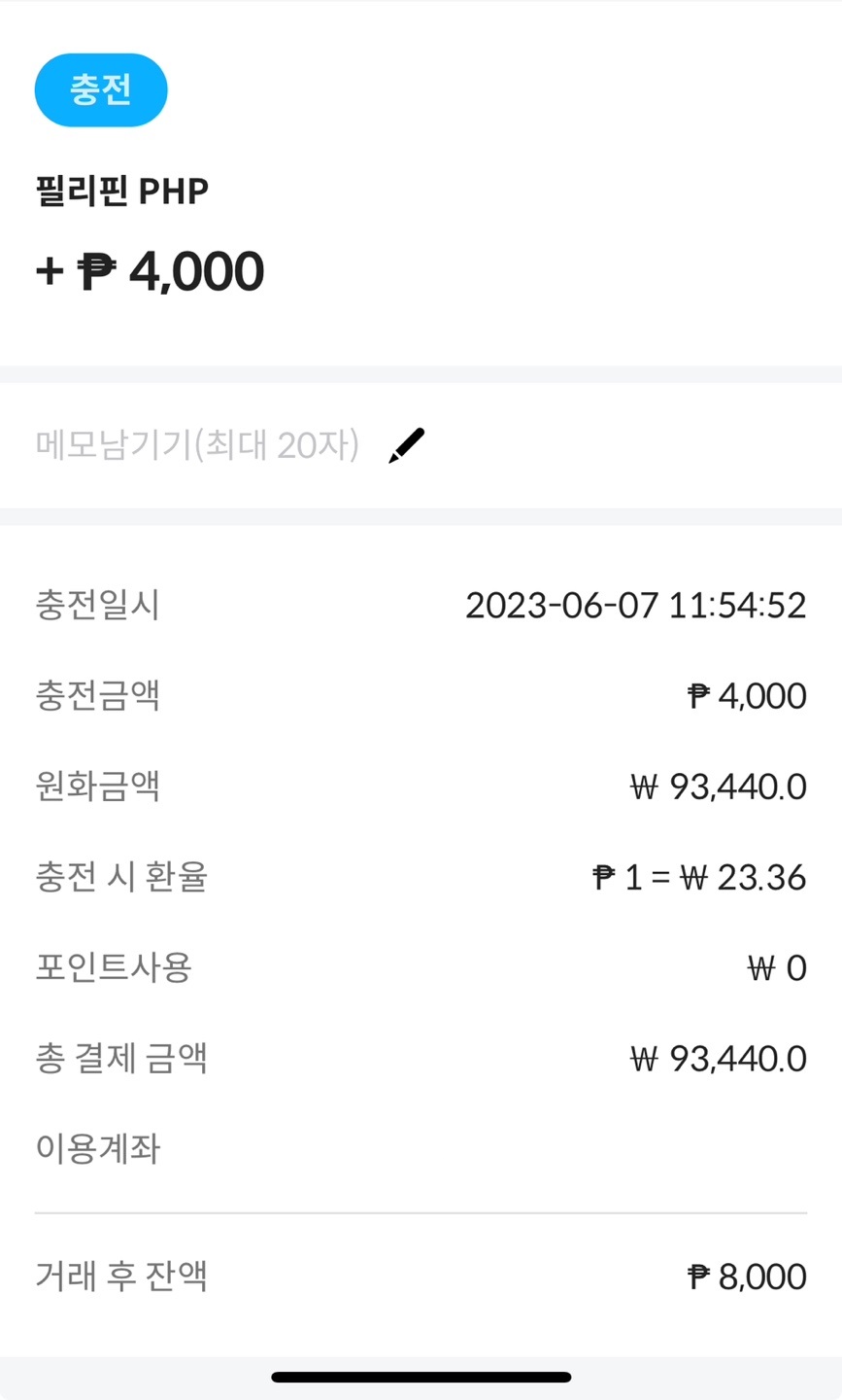 트래블월렛 앱을 이용해서 필리핀 페소를 충전할 수 있기 때문에 때때로 나눠서 충전했다. (환율이 떨어질 수도 있으니까) 즉시 환전을 수수료 없이 기준환율로 할 수 있고 편리하기 때문에 난 트래블월렛을 선택했다.