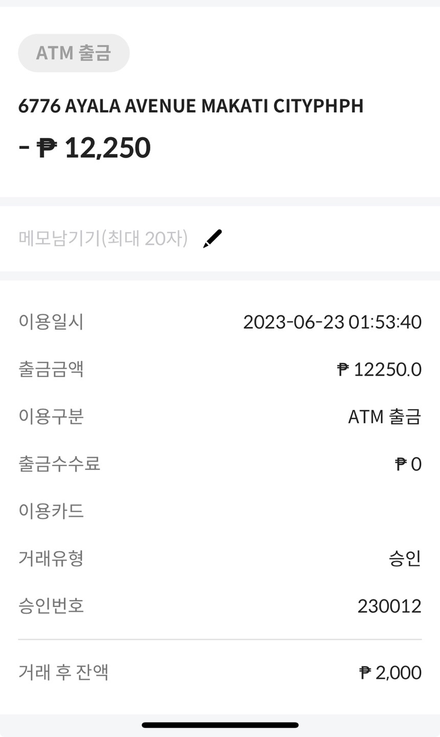 출금 수수료가 0페소로 나와 있지만 난 12000페소만 현금으로 받았고, 250페소는 수수료다.